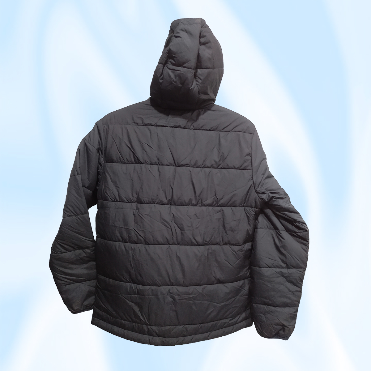 Black solid jacket, has a hood, 2 pockets, zip closure, long sleeves, straight hem, and polyester.