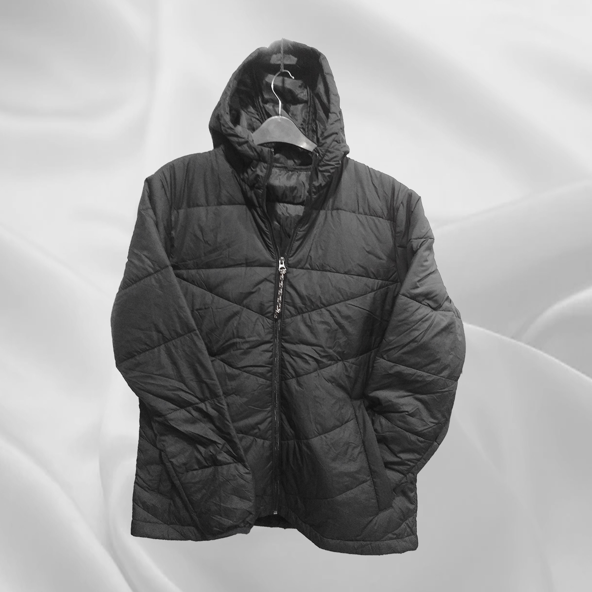 Black solid jacket has a hood, 2 pockets, zip closure, long sleeves, straight hem, and polyester.