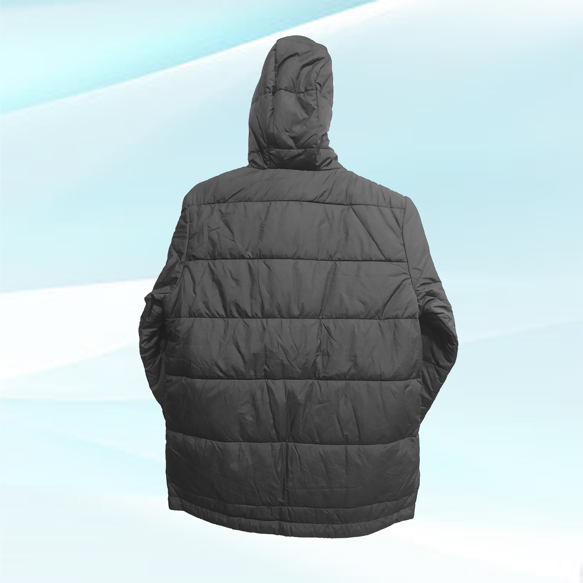 Black solid jacket, has a hood, 2 pockets, zip closure, long sleeves, straight hem, and polyester.
